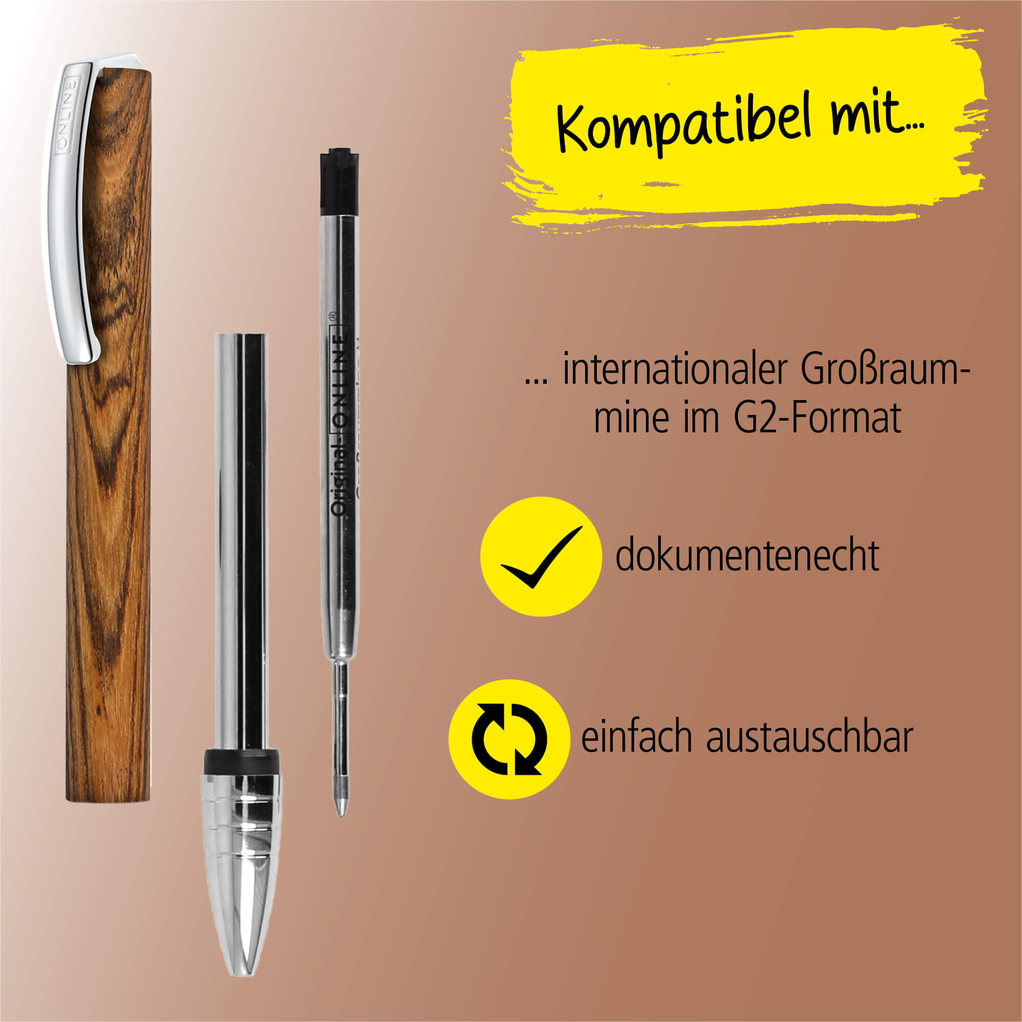 HOCHWERTIGE MINE: Um einen leichten Austausch zu ermöglichen, ist der Drehkugelschreiber mit einer Großraummine im Standardformat G2 und Edelstahlspitze ausgestattet. Dokumentenecht in schwarz schreibend und in Strichstärke medium.