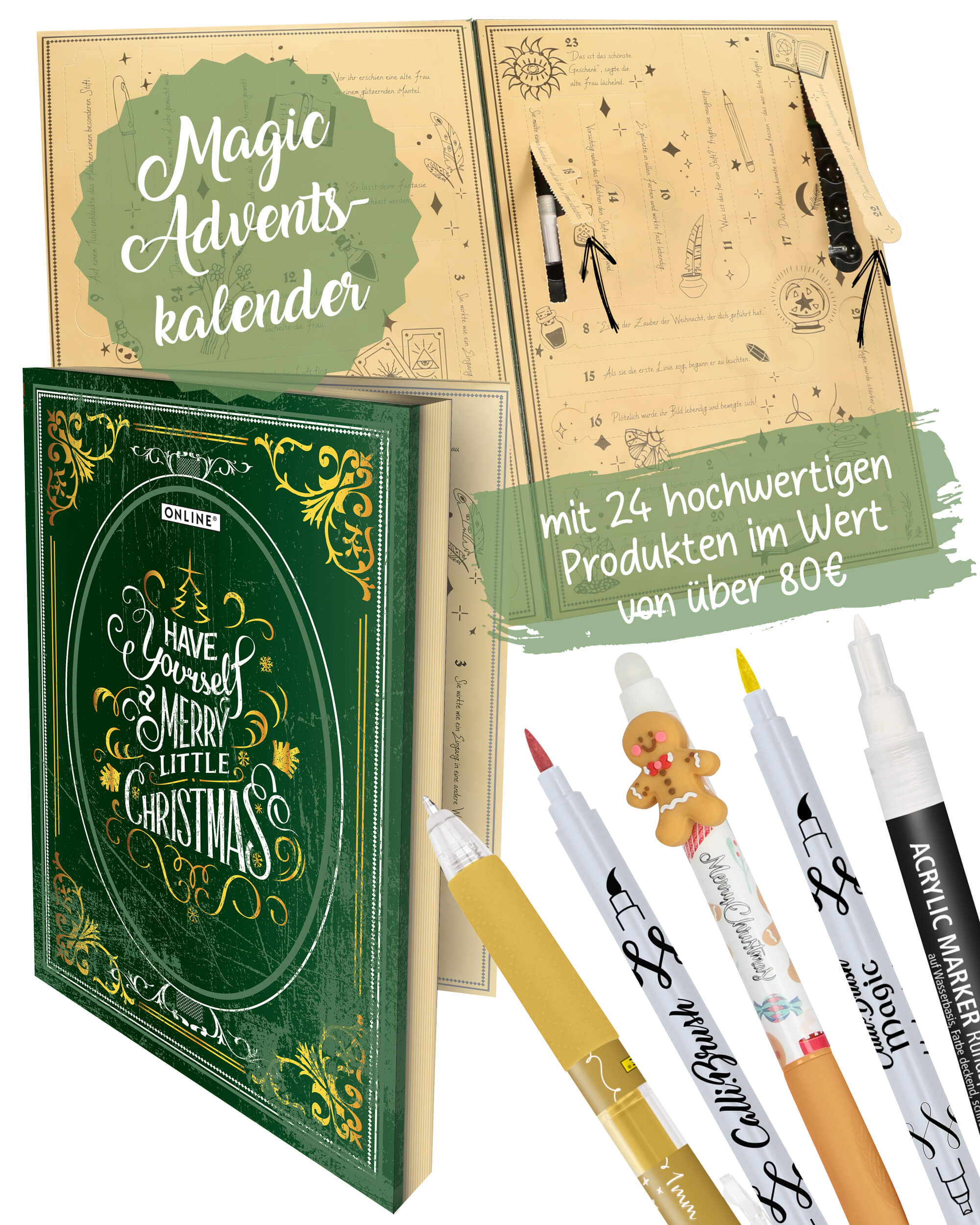 Magie-Fans aufgepasst: Der außergewöhnliche Adventskalender sorgt für Zauberschulen-Feeling. Mit allerhand magischen Stiften wie radierbaren Gelschreibern, Calli.Brush Magic und Acrylstiften ist alles enthalten, was das kreative Herz begehrt! Die perfekte Grundausstattung zum Kalligraphieren, Schönschreiben & Bullet-Journaling.